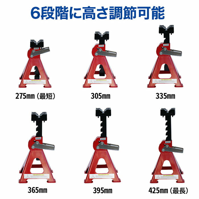 ・愛車を傷つけないラバーパッド付き ・6段階の高さ調節が可能 ・安心・安全のロックレバー 【商品詳細】 本体サイズ:幅205×高さ240×奥行き188mm 重量:1.5kg (1個) 最低/最高サイズ:275mm/425mm 最大質量:3.0t 入り数:2基 [ご注意] ※必ず、固く平面で傾斜の無い床面で使用してください。